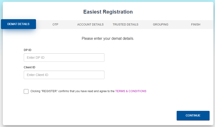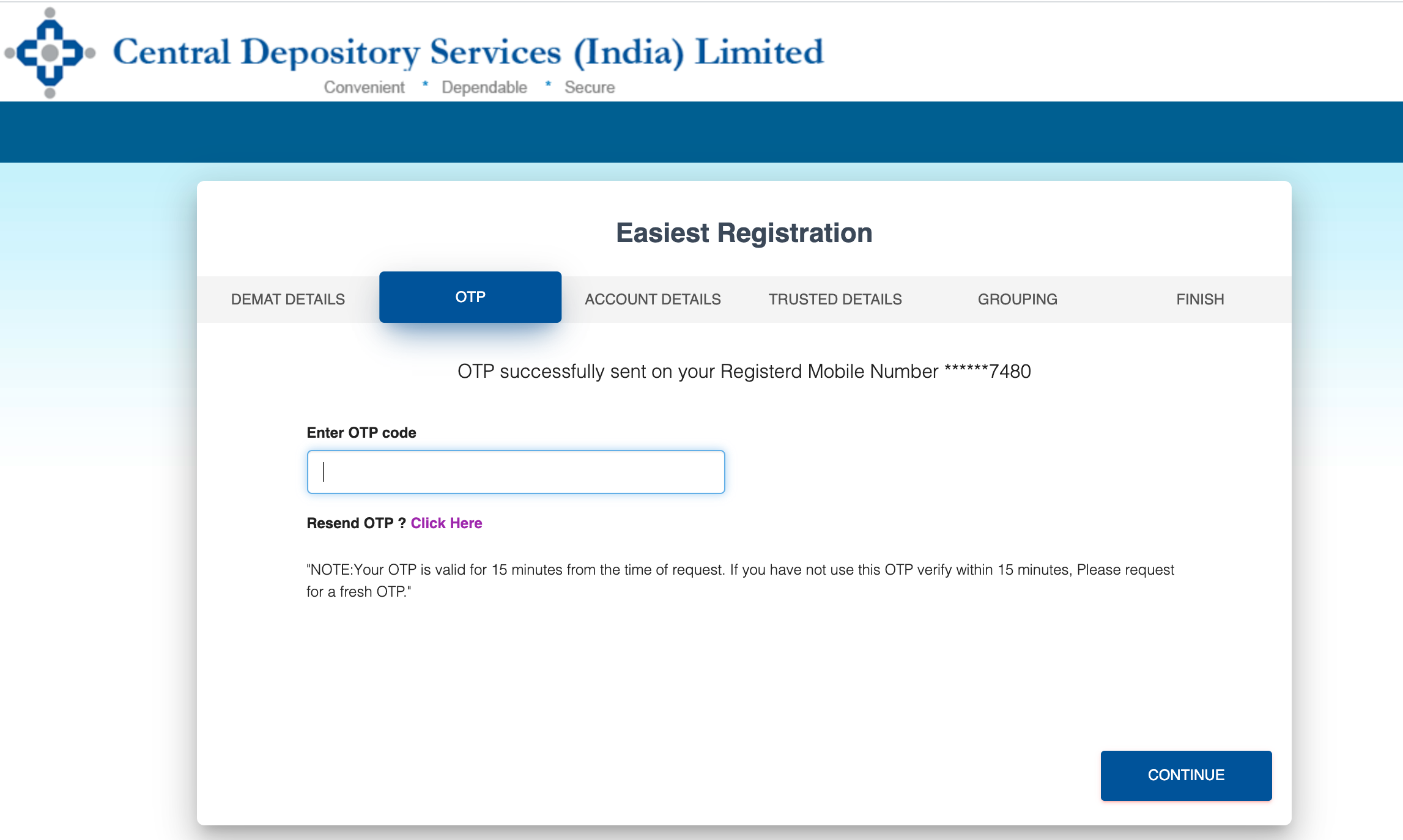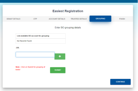- Finished is an optional step If you have more than one demat account with CDSL from different brokers. You can group all of them through this option. Just click on the existing CDSL demat account that needed to be added as a trusted account and click on continue. You can also skip this step by simply clicking on the continue button.