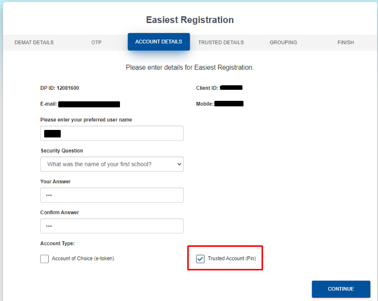 - Under the Accounts Details section, enter the preferred username, answer the security question and tick on ‘Trusted Account (Pin)’ and click on continue.