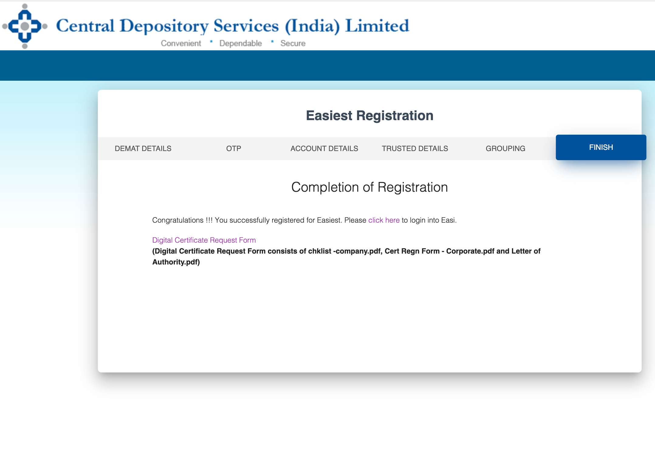 - The registration is now Finished. Once your existing broker authenticates this request, CDSL account will be activated for this BO ID and you will receive your temporary password and Pin through email within 48 hours.