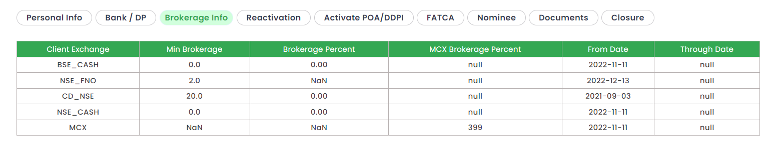 - Go to the Brokerage Info tab. Here you can see all the segments activated in your account and the brokerage applicable on it.