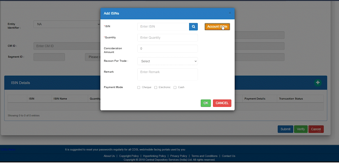 - Now, under ISIN details, click on ‘+’ icon and go to Account ISIN’s. You can see the list of all the holdings. Select the ISIN that you want to transfer, enter the quantity, and select the reason for trade.