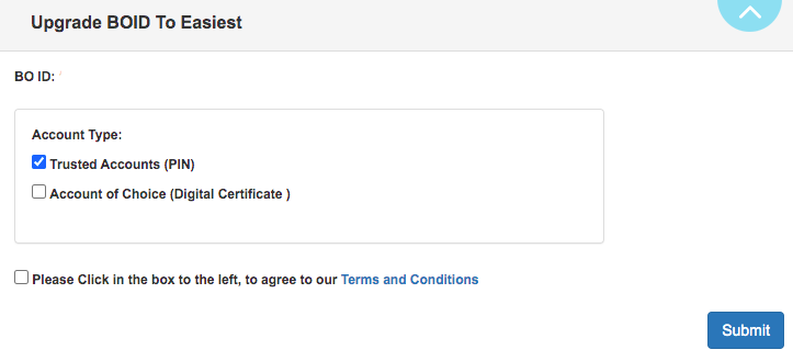 - Select ‘Trusted Account (PIN)’ as the Account Type, agree to the terms and conditions and click on submit.